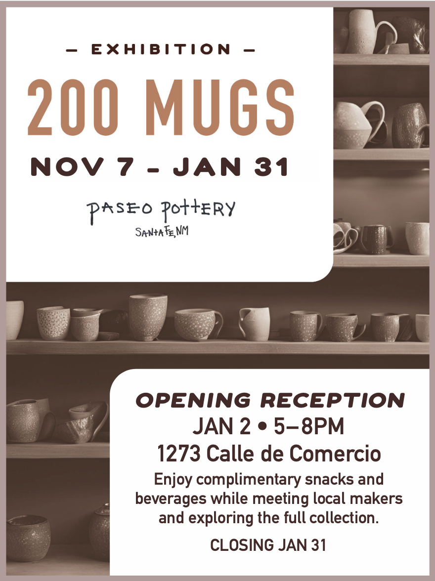 Our annual holiday exhibit returns with 200 Mugs—a celebration of form, function, and the perfect handmade gift. Featuring a diverse collection of locally crafted mugs by regional ceramic artists, this show offers something for every coffee lover, tea drinker, or art enthusiast on your list. Come find your next favorite mug—or two—and support local creativity this season.